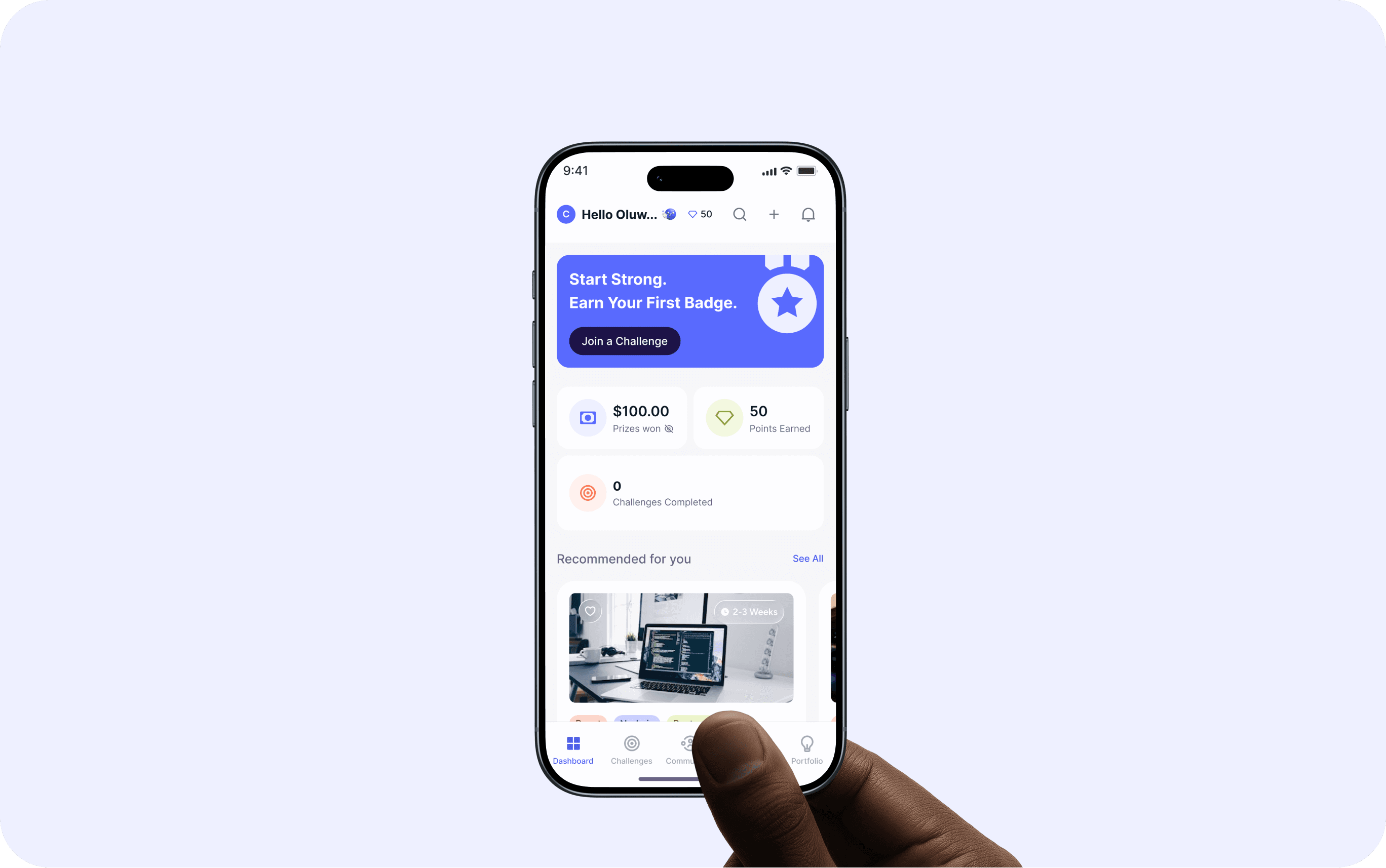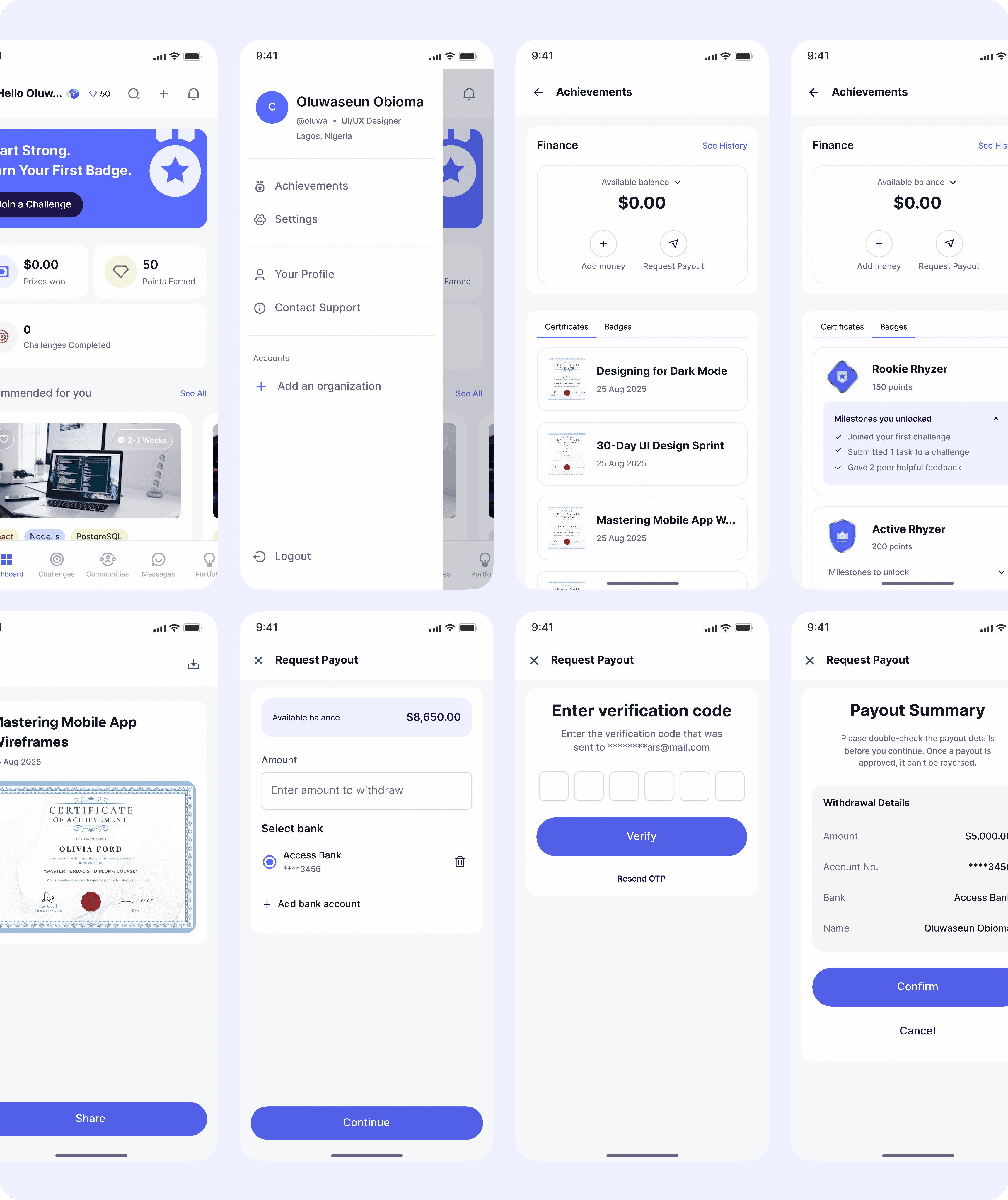To make progress feel rewarding and visible, we introduced a structured badge system that recognizes key milestones throughout the user journey. Badges are awarded for actions such as completing a first challenge, submitting work on time, receiving peer feedback, and consistently engaging in the community. This system not only celebrates achievements but also reinforces positive behaviors, motivates continued participation, and gives users a clear sense of growth and momentum as they advance on the platform.
